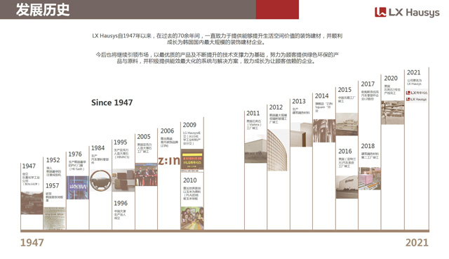 2021年,LX Hausys公司归入LG集团 兄弟公司“LX Holdings集团”旗下,从21年7月1日起公司正式更名为“LX Hausys”,并重新出发开启新的征程努力实现更高的飞跃。