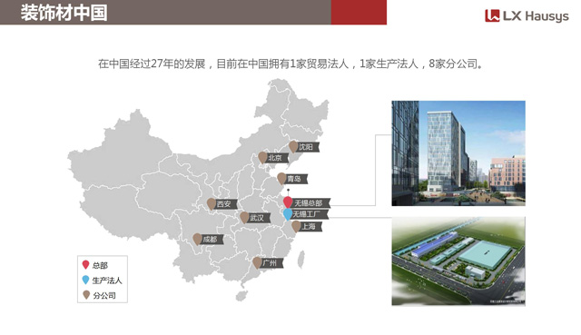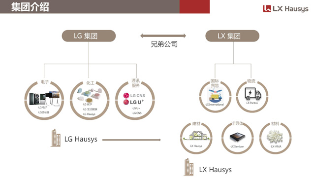 LX Hausys是韩国最具代表性的装饰材料集团。自2009年从LX Hausys化学分离后,成为引领韩国装饰建材业发展的第一企业。LX Hausys以1958年推出塑料地板为开端,先后推出了韩国最早的塑料门窗、世界市场份额最大的高光板、室内装饰材大理石、建筑一体型太阳能发电系统等差异化产品和服务,60多年来为顾客的生活空间变得更加舒适和幸福做出了积极第贡献。